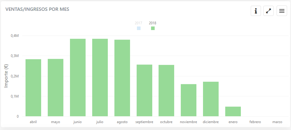 Para cada mes del año en curso, podemos ver el total de ingresos, y otra barra al lado representando el mismo mes del año anterior.