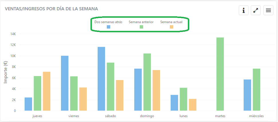 Esta gráfica representa los ingresos semanales derivados de las ventas, y lo hace agrupando por día de la semana y comparando con las dos semanas anteriores a la semana de la caja o cajas seleccionadas.