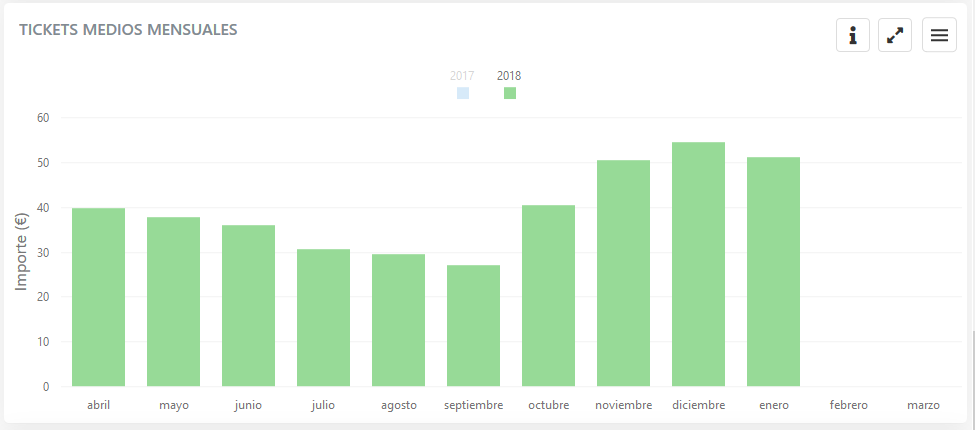 Para cada mes del año en curso, puedes ver la media de ingresos por ticket, y comparar el dato con el del mismo mes en el año anterior.