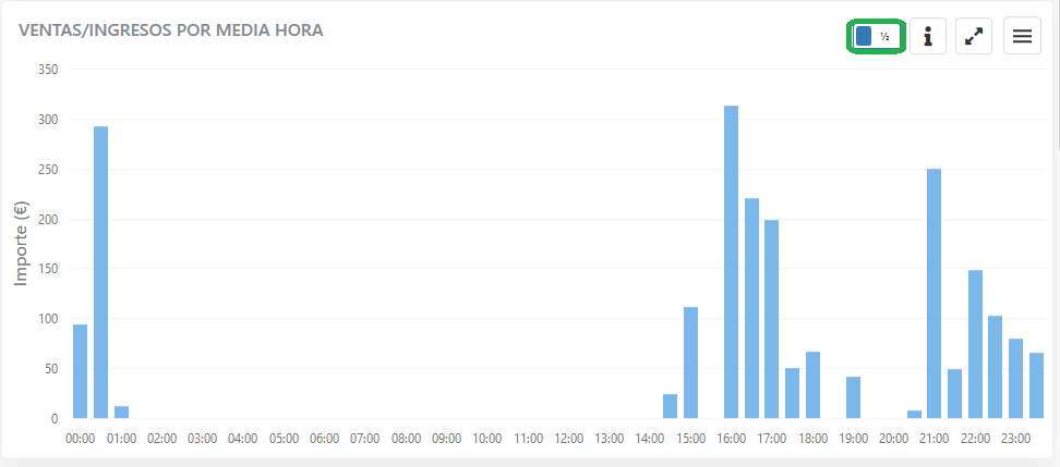Esta gráfica muestra los ingresos diarios derivados de las ventas, y lo hace agrupando por franjas de 1 hora o de 1/2 hora.