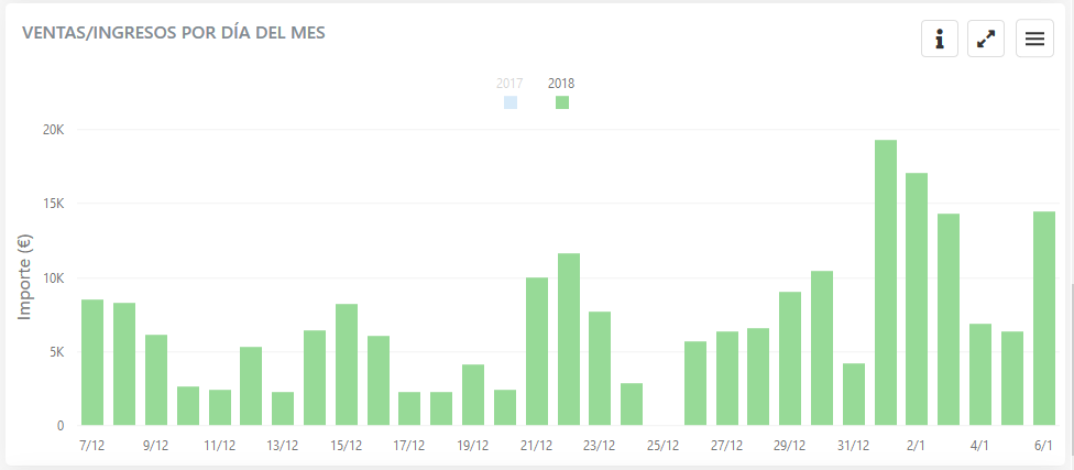 Para cada día (del 1 al 31) del mes en curso, podemos ver el total de ingresos, y otra barra al lado representando el mismo día del mes en el año anterior.
