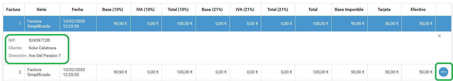 Los datos se muestran en una tabla con las siguientes columnas agrupables: número de factura; serie a la que pertenece; fecha; base, IVA y total para cada porcentaje de IVA; acumulados para totales y bases imponibles; cobrado en tarjeta y cobrado en efectivo.