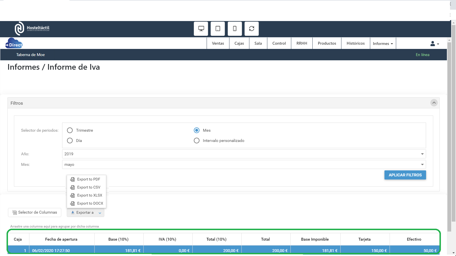 Los datos se muestran en una tabla con las siguientes columnas en la que también dispones de un selector: caja; fecha de apertura; IVA y total para cada porcentaje de IVA; acumulados para totales y bases imponibles; cobrado en tarjeta y cobrado en efectivo.