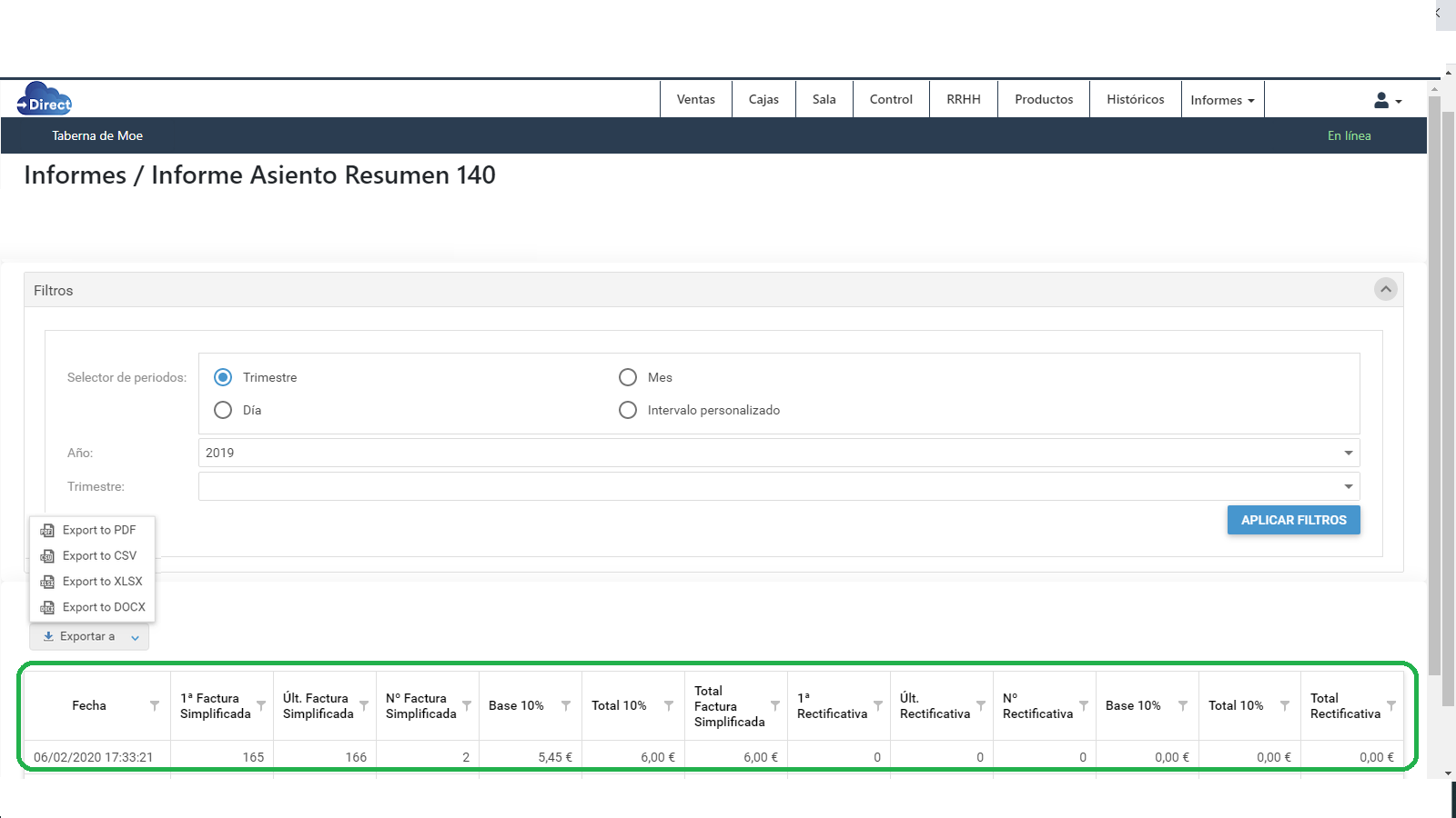 El informe asiento resumen 140 dispone de filtros con un selector de periodos (día, trimestre, mes o personalidado desde – hasta), año y trimestre. Y muestra días naturales.