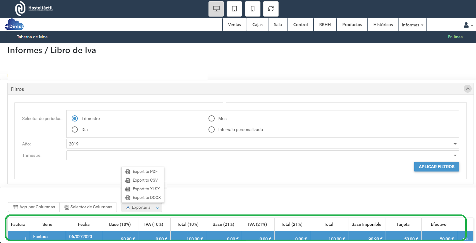 El informe IVA dispone de filtros con un selector de periodos (día, trimestre, mes o personalidado desde – hasta), año y trimestre. Y muestra datos de cajas cerradas.