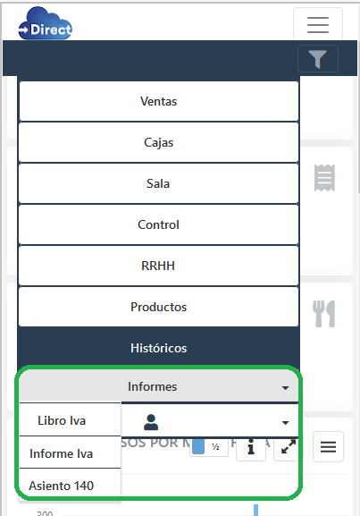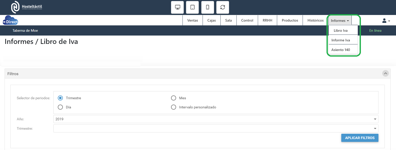 Puedes acceder a los informes, libro de IVA y asiento 140 desde la pestaña informes, situada en la cabecera de la plataforma.