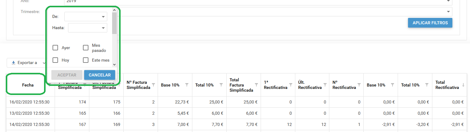 Los datos se muestran en una tabla con las siguientes columnas: fecha y hora; número de primera factura simplificada; número de la última factura simplificada; total de facturas simplificadas; base y total para cada porcentaje de IVA de facturas simplificadas; valor total en euros para facturas simplificadas; número de la primera factura rectificativa; número de la última factura rectificativa; total de facturas rectificativas; base y total para cada porcentaje de IVA de facturas rectificativas; y valor total en euros para facturas rectificativas.