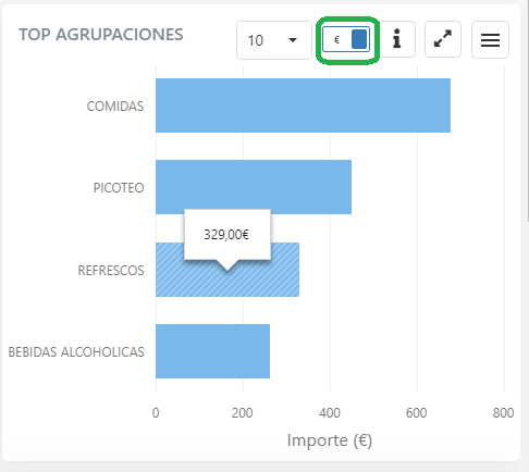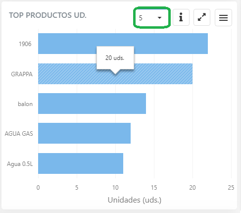 Puedes elegir cuántas agrupaciones mostrar (hasta un máximo de 10), y si quieres ver el top en base al importe (en moneda local) o en base al número de unidades vendidas.
