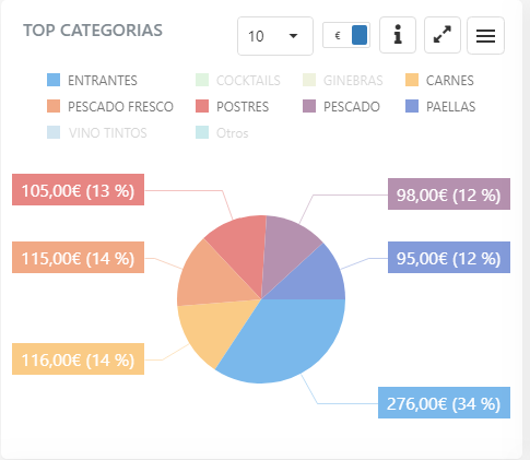 Desde la pestaña del panel productos, puedes sacar el Top 10 para categorías de productos de venta y agrupaciones de categorías, así como Top 20 de productos de venta más vendidos por importe y por unidades.