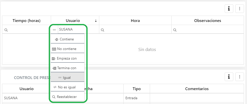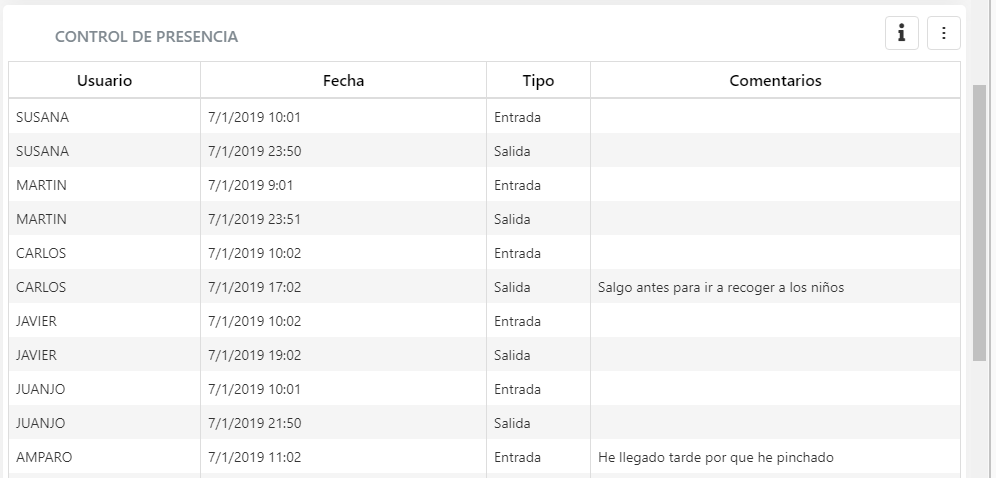Nos muestra el nombre del empleado, la fecha y la hora, si la operación ha sido de entrada o de salida, y finalmente si hay algún comentario asociado a ese fichaje (que se notifica como incidencia).