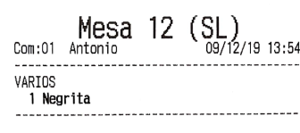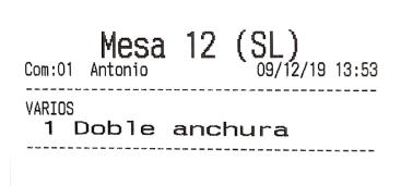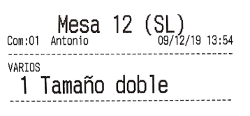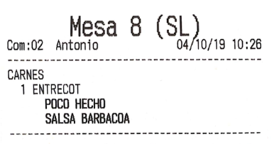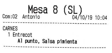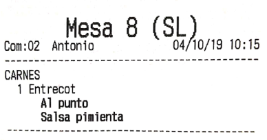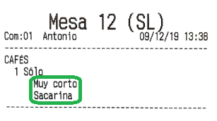 Si está marcada la opción Comentarios en una sola línea, todos los comentarios añadidos para el producto salen por la impresora de cocina en la misma línea. A la izquierda, en el ejemplo.