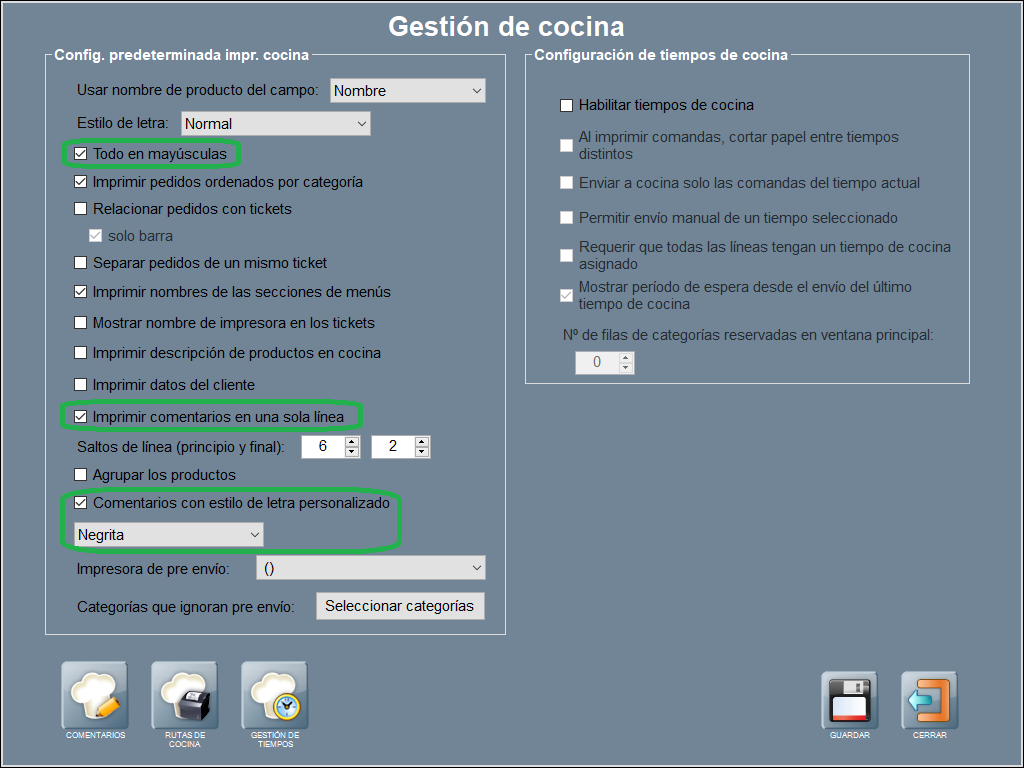 En la ventana de Gestión de cocina, en el apartado Configuración predeterminada de la impresora de cocina, hay varias opciones que afectan a la impresión de comentarios a cocina, que es bueno que conozas y que explicamos a continuación.