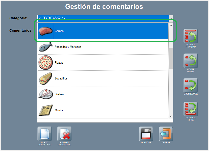 Para añadir un nuevo comentario, seguimos con el ejemplo de las ‘Carnes’, selecciona la familia en el desplegable y pulsa NUEVO COMENTARIO.