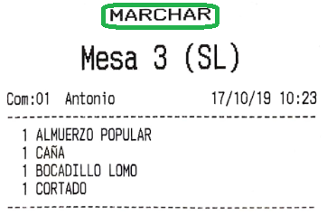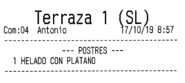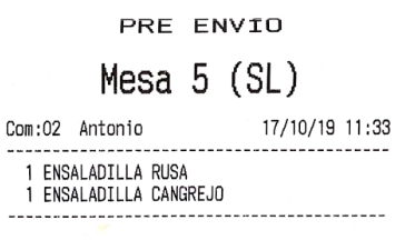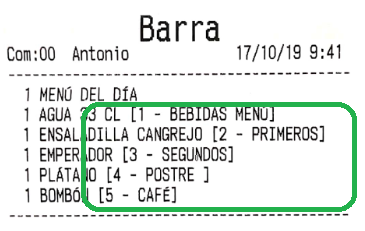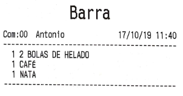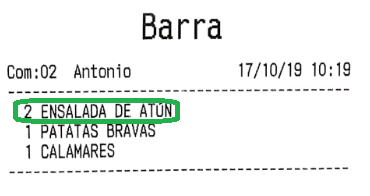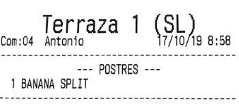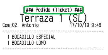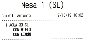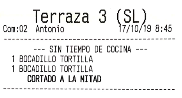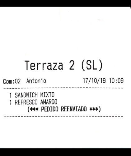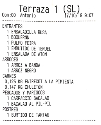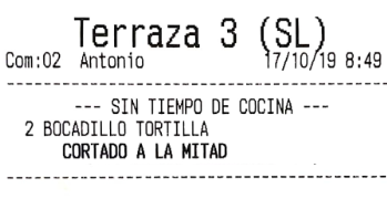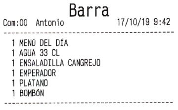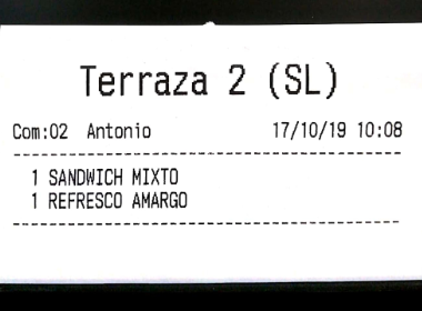 Por ejemplo, imagina que en el apartado anterior hemos configurado los ‘bocadillos’ para que salgan por una impresora, y las ‘bebidas’ por otra. El resultado, que al enviar pedido a cocina, son dos comandas las que salen, no una. De haber asignado la misma impresora a los dos productos, por defecto saldría una sola comanda (esto es configurable en gran medida, como más tarde veremos, en las opciones de impresión).