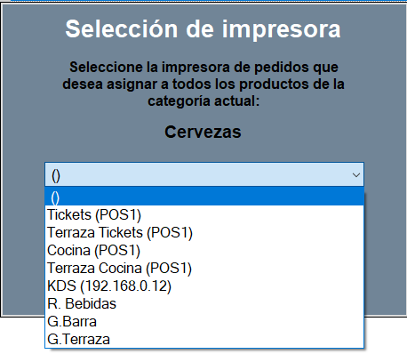 Y luego pulsa sobre ASIGNAR IMPRESORA, lo que mostrará una ventana nueva con un desplegable desde donde el que elegir la impresora para todos los productos de la categoría.