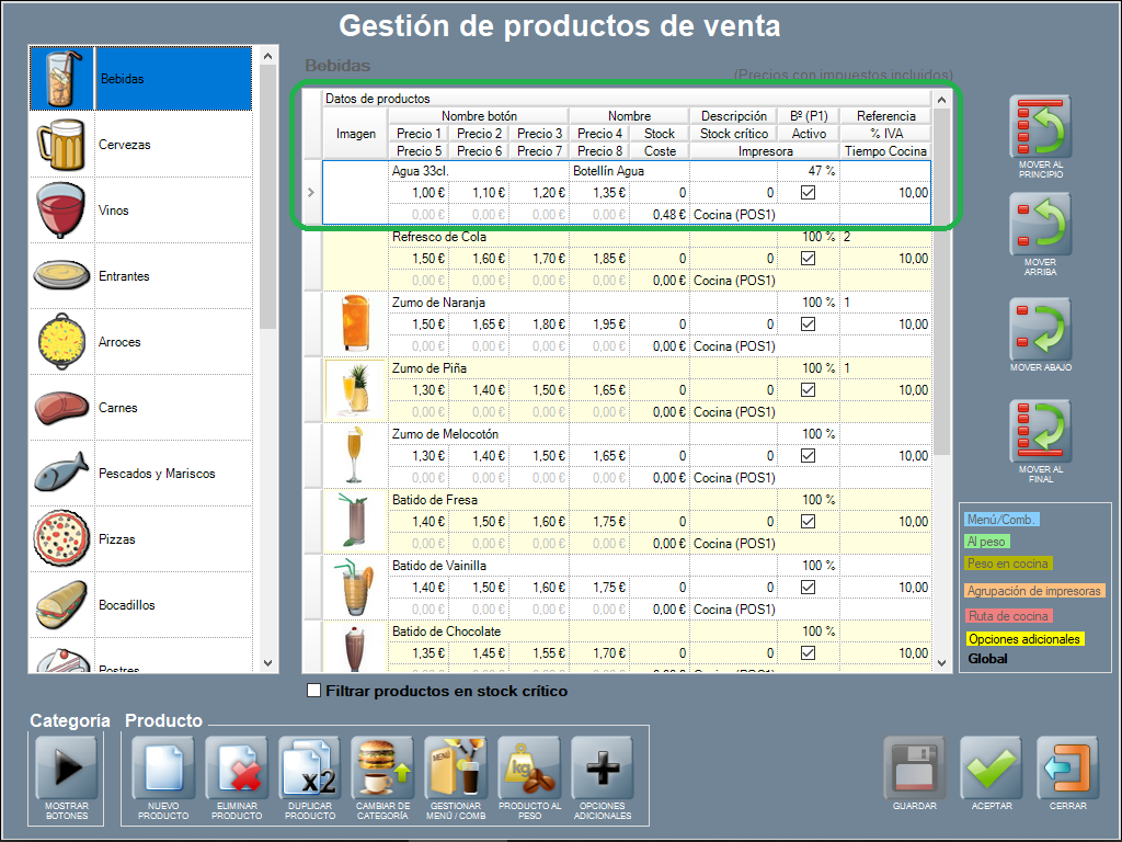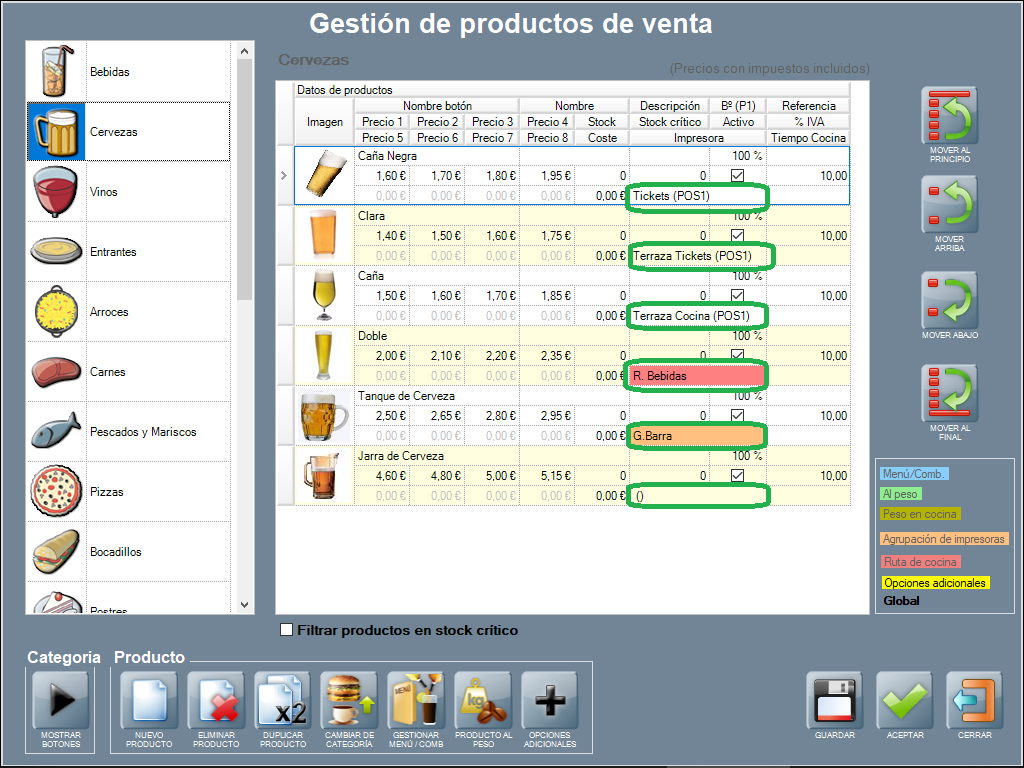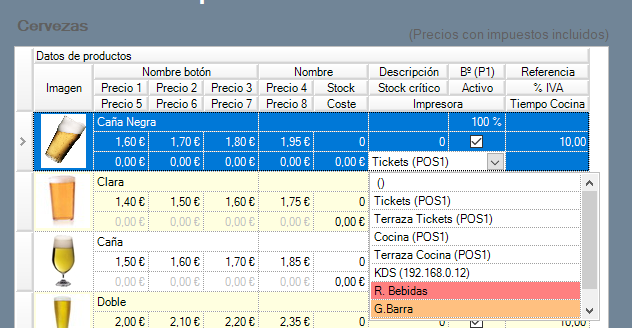 Para que las comandas con los productos salgan por las impresoras, es necesario vincular cada producto o categoría de productos con las mismas. Esto puede hacerse desde la ventana de gestión de productos de venta, tal y como se explica en los siguientes párrafos. En la imagen de ejemplo puedes ver la categoría ‘Cervezas’, con varios productos donde a cada uno se le ha asignado una impresora diferente (las tres primeras con fondo en color blanco), una ruta de cocina (fondo rojo), una agrupación de impresoras (fondo naranja), o sin impresora asignada (paréntesis vacío).