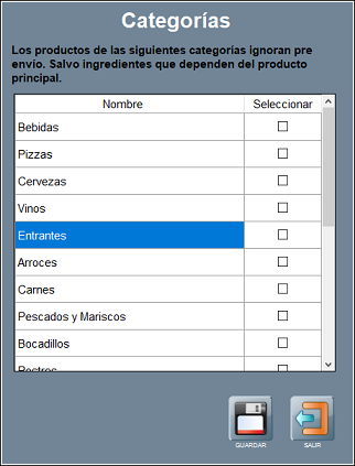 • Imprimir solo si hay productos de las categorías seleccionadas: este filtro te permite excluir categorías de la impresión. Al activarla, hay que pulsar sobre SELECCIONAR CATEGORÍAS, y elegir las categorías que quieres incluir en la impresión. Los productos que estén en categorías que no hayas seleccionado aquí, no se imprimirán en la comanda.