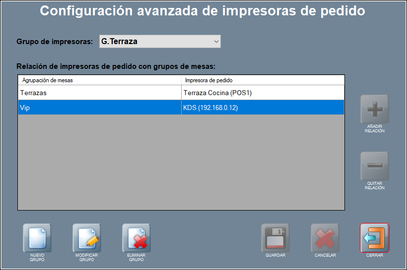 En apartados anteriores hemos introducido los grupos de impresoras. Te recomendamos que vuelvas al principio del capítulo de impresoras, si no los conoces. En caso contrario, si ya tienes una idea general de los grupos de impresoras, sigue leyendo. Dando por hecho que ya creaste grupos de impresoras, la forma de relacionar agrupaciones de mesas con impresoras de pedido es similar a la vista para tickets, tan solo tienes que ir añadiendo líneas con las relaciones, tantas como quieras. El programa recorrerá la lista de arriba a abajo, y una vez encuentre una coincidencia, enviará la comanda por esa impresora.
