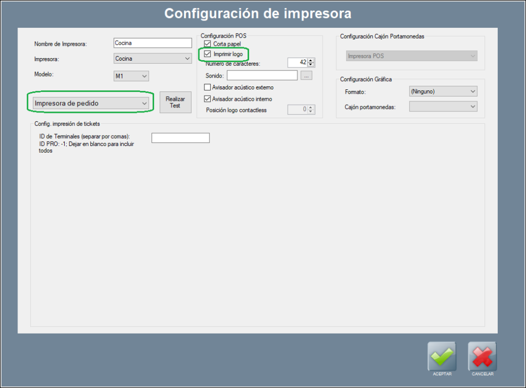• Utilizar configuración por terminales: esta opción sirve para filtrar por ID de terminal. Si esta opción está activa, solo se utilizará esta línea en caso de que el ID de terminal coincida con el que se especificó en la configuración inicial de la impresora (ver Instalación y configuración genérica de impresoras).