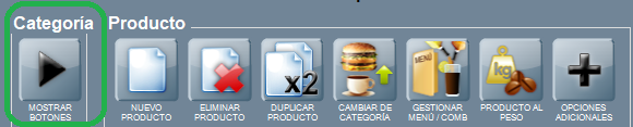 • Para asignar una impresora a una categoría: esta es la forma rápida de vincular todos los productos en una categoría para una impresora dada. En la misma pantalla de antes, pulsa sobre MOSTRAR BOTONES, abajo a la izquierda, para que se despliegue el menú de categorías.
