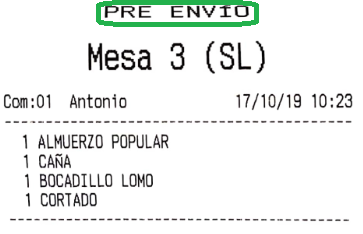 • Categorías que envían pre envío: puedes excluir categorías para que no entren en pre envío, y se envíen directamente a MARCHAR. En la imagen de ejemplo puedes ver que, al pulsar sobre el botón PEDIDO A COCINA, se han enviado dos comandas: una con el PRE ENVÍO y otra para MARCHAR la bebida inmediatamente.