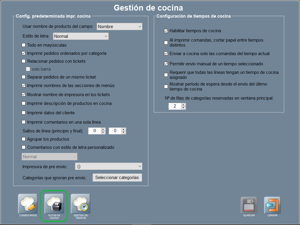Fíjate que en esta ventana previa a las rutas de cocina, tienes también la configuración predeterminada de impresoras de cocina, y la configuración y gestión de los tiempos de cocina, y la configuración de comentarios.