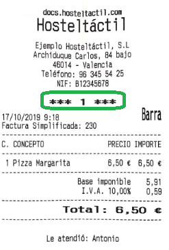 • Relacionar pedidos con tickets: esta es una opción muy interesante para algunos escenarios, por ejemplo para los pedidos para llevar. Al activar esta opción, se asignará un número a cada pedido, que saldrá en la cabecera de los tickets y los pedidos. De esta forma, cada ticket tendrá un número asignado, que también se imprimirá en las comandas de ese pedido, lo que facilita hacer entrega del producto o pedido, por ejemplo cantando el número de pedido que está disponible para recoger. No confundir estos números con los números de serie o de factura, que son números más largos y que, en la práctica, serían tediosos para esta función. Para evitar que estos números de pedido se hagan excesivamente largos (con más de tres dígitos), el contador se resetea cada vez que reinicias Hosteltáctil® Pro.