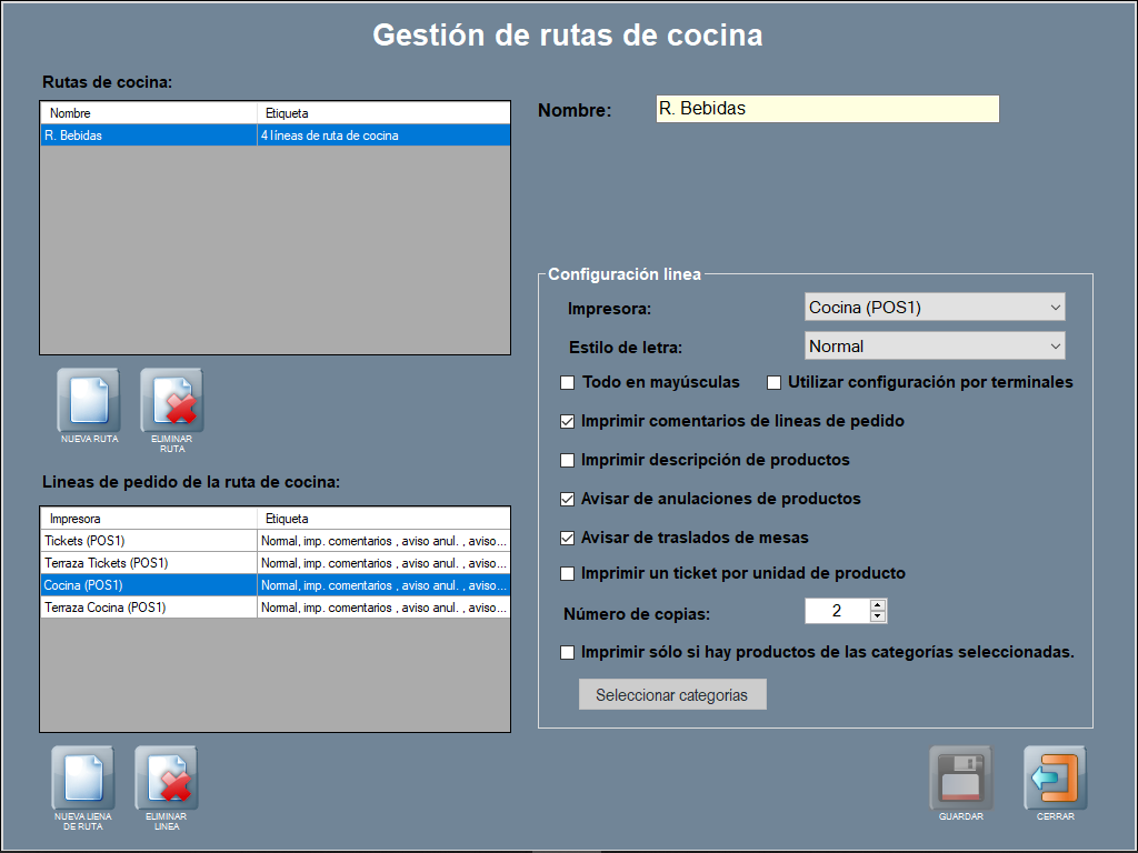 • Impresora: aquí es donde defines la impresora que va en esta línea de la ruta de cocina.