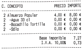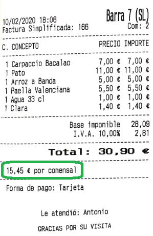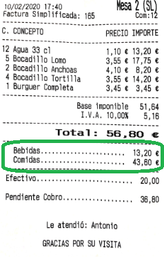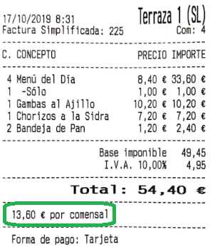 Imprimir importe por comensal: se imprime una línea con la media en euros por comensal, es necesario introducir el número de comensales en la cuenta.