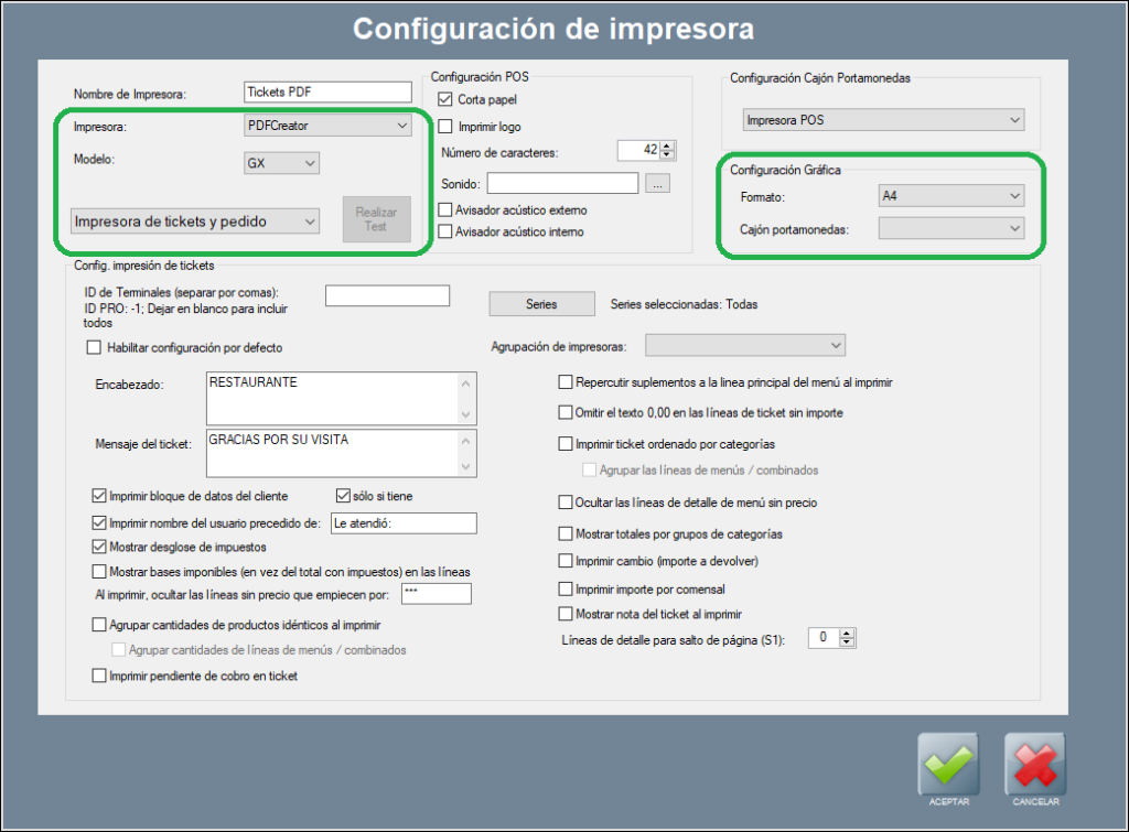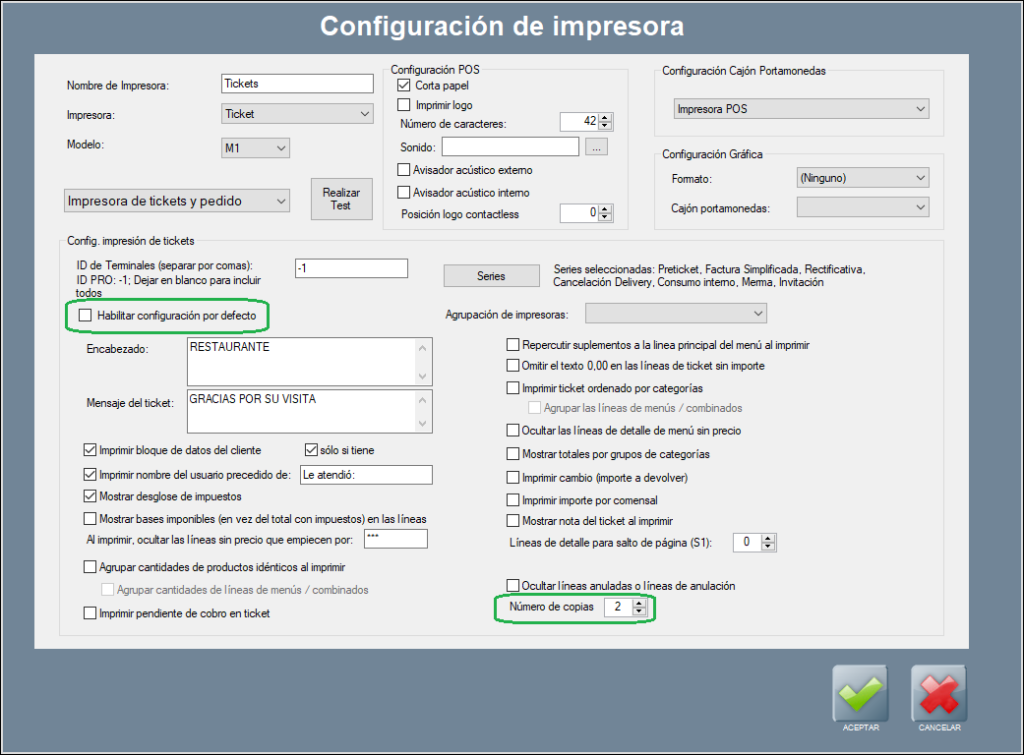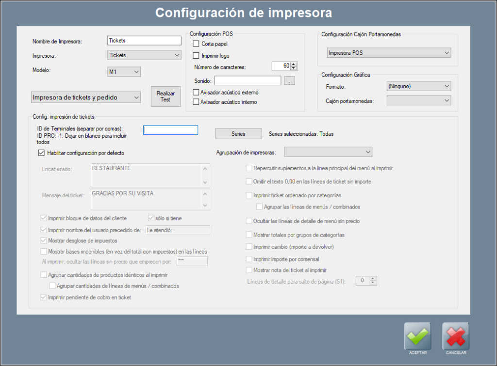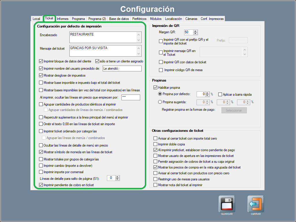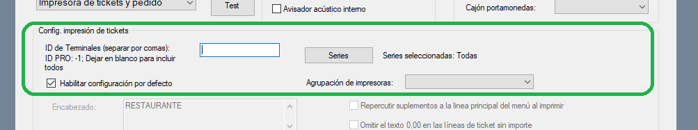 A continuación, explicamos todas estas opciones y parámetros, y cómo abrir la configuración por defecto de impresión de tickets.