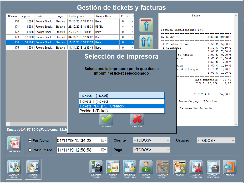 Una vez instalada y configurada la impresora PDF, estará disponible cuando pulses el botón IMPRIMIR TICKET / FACTURA desde la ventana de Gestión de tickets y facturas, que se abre al pulsar GESTIÓN TÍCKETS, en la ventana principal de la aplicación.