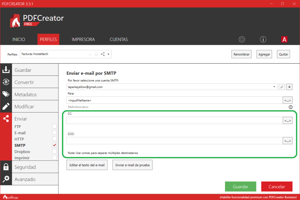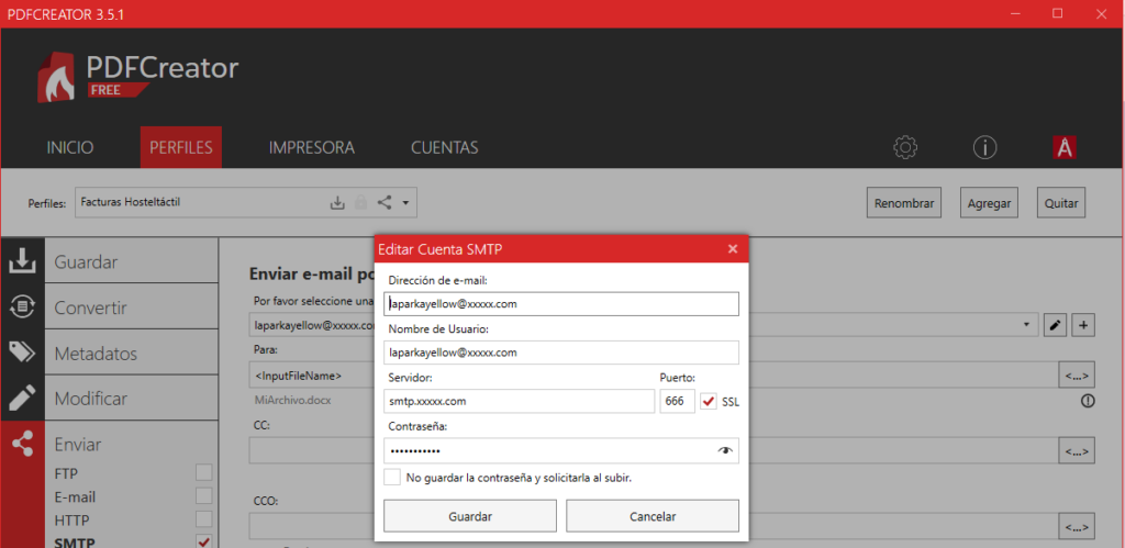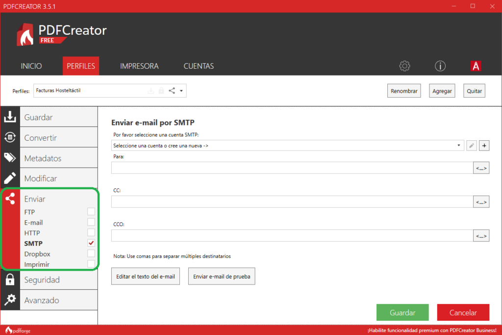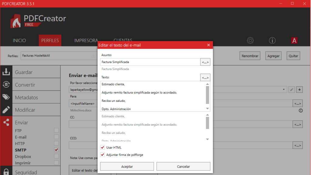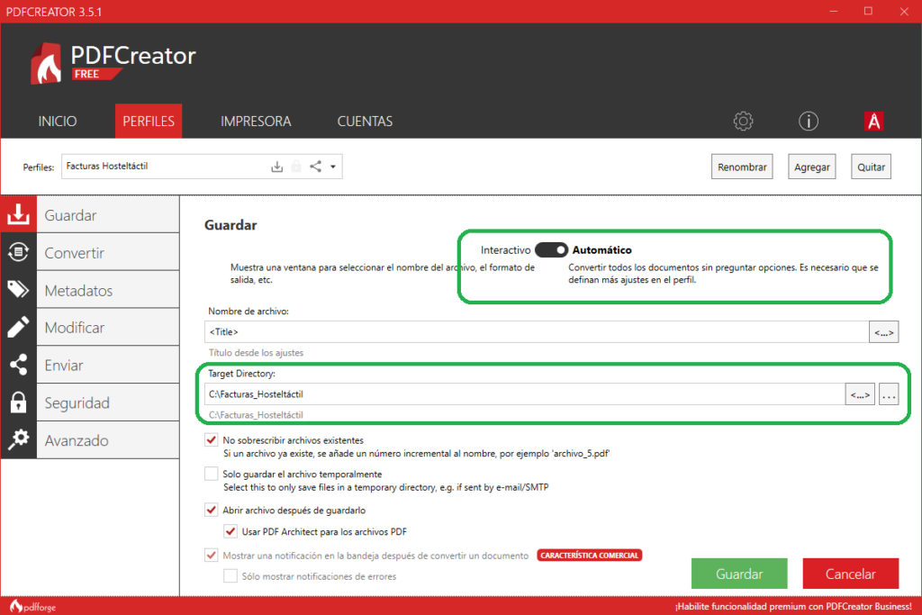 Para finalizar, tienes que configurar el comportamiento automático de PDFCreator para guardar y enviar el PDF creado.