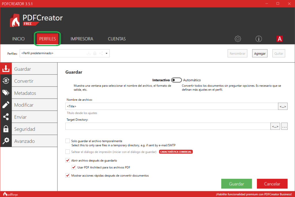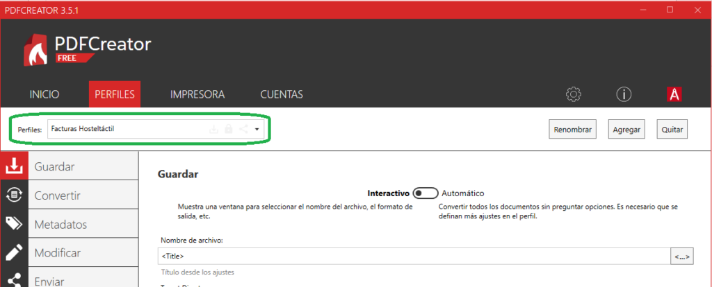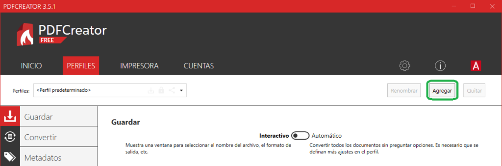 Lo primero es crear un nuevo perfil, desde la pestaña de Perfiles desde el menú principal en la ventana inicial al abrir la aplicación PDFCreator.