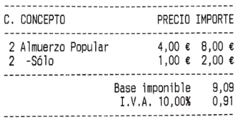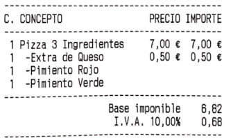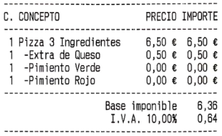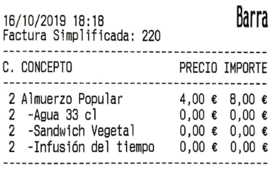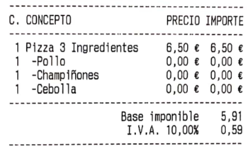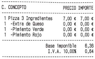 Ocultar las líneas de detalle de menú sin precio: esta opción hace que las líneas de menú o combinados, que tienen el precio a cero, no aparezcan impresas. En la imagen de ejemplo, puedes ver el mismo ticket que veíamos más arriba, pero con esta opción activada: los ingredientes sin suplemento no se muestran esta vez.