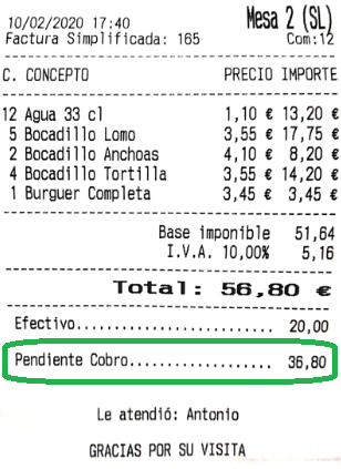 - Imprimir pendiente de cobro en ticket: si el ticket no está abonado, imprime una línea en el mismo, donde dice cuánto falta por cobrar.