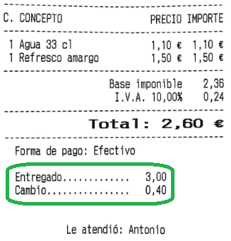 Imprimir cambio (importe a devolver): añade una línea impresa con el cambio a devolver.