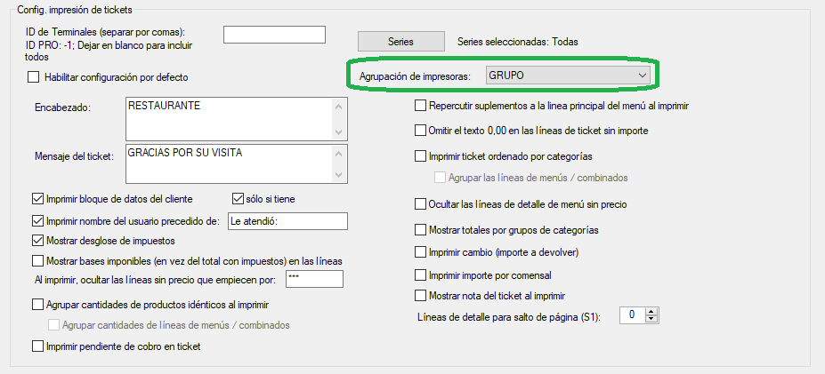 Agrupación de impresoras: en este desplegable aparecen los grupos, o agrupaciones de impresoras, que tengas creados. Selecciona este filtro para redirigir los tickets según grupos de mesas a impresoras distintas.
