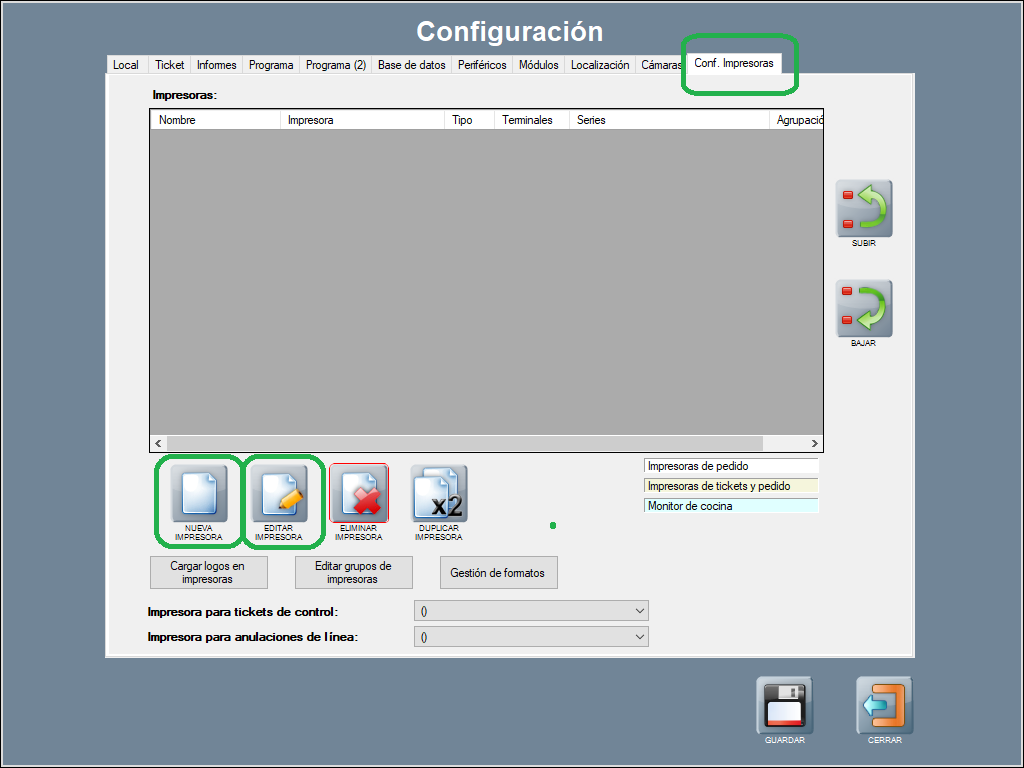 Para los envíos de tickets, se utiliza la tabla principal de impresoras, en Panel de Gestión / Configuración / Configurar Opciones / Conf. Impresoras.