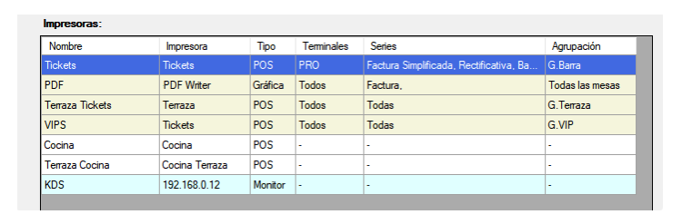 La tabla de impresoras que se muestra aquí será la que se usará para decidir por dónde saldrán los tickets (en la imagen de abajo tienes varias impresoras, con diversos filtros: fíjate en los mismos, y en el orden en que están puestas).