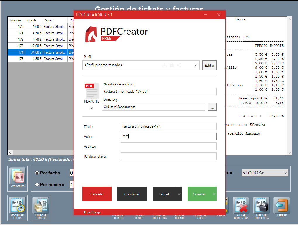Para poder generar facturas simplificadas y enviarlas por correo electrónico automáticamente es necesario tener instalada una versión de la aplicación PDFCreator superior a la v.3.0. La versión gratuita contiene las funcionalidades básicas necesarias.