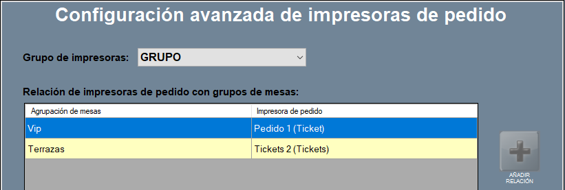 Agrupación o grupo de impresoras: si hay filtro de grupo, entonces el programa salta a la tabla en configuración de grupos de impresoras, y recorre esa lista buscando una agrupación de mesas que corresponda con la utilizada en el ticket.