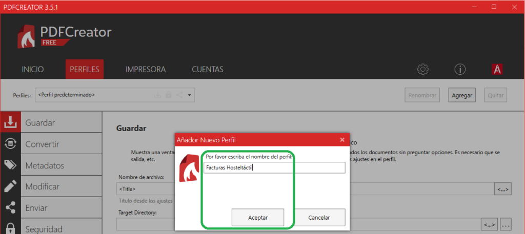 A continuación escribe el nombre del perfil, por ejemplo, ‘Facturas Hosteltáctil’.