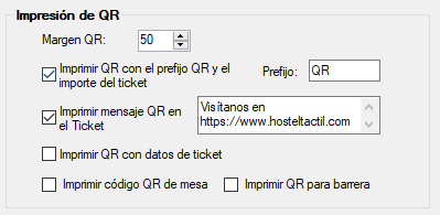 Estas opciones se activan desde la misma ventana del apartado anterior en el apartado Impresión de QR, donde configuramos la impresión por defecto de tickets, es decir en Panel de gestión / Configuración / Configurar opciones / Ticket.