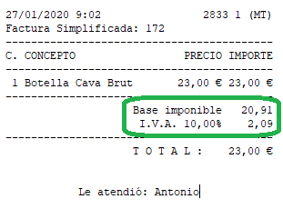 - Mostrar desglose de impuestos: muestra base imponible e I.V.A., junto al total del ticket. Si no activas esta opción, se omite mostrar el desglose. En el ejemplo, vemos que esta opción está activada, bajo el total.