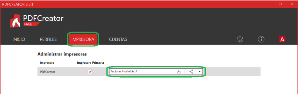 Por último, y tras guardar cambios, dirígete a la pestaña IMPRESORA y selecciona el perfil creado como predeterminado.