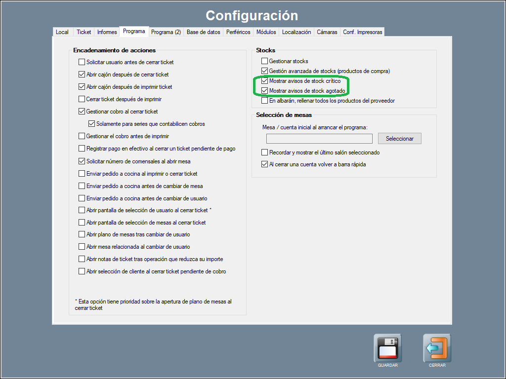 Si llevas control de stocks, te interesa conocer estas configuraciones. En Panel de gestión / Configurar opciones / Programa, en la sección stocks, puedes configurar una serie de avisos en la pantalla principal de la interfaz, que explicamos a continuación.