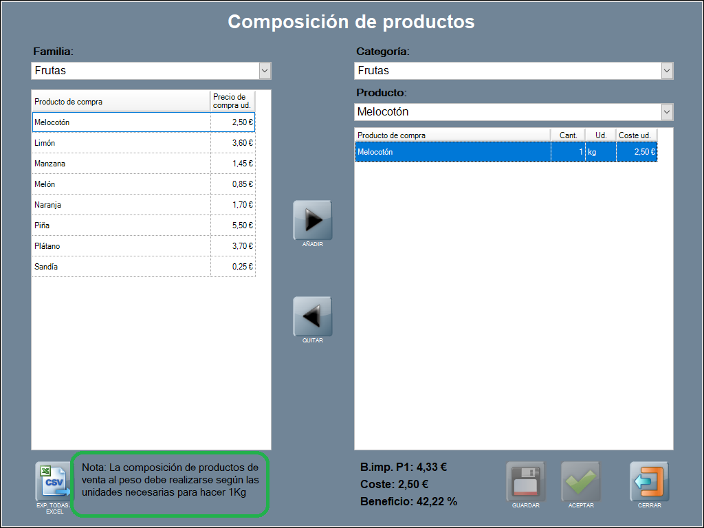 En el ejemplo, el producto de venta ‘melocotón’ descuenta la cantidad proporcional en kilos del producto de compra ‘melocotón’, a un coste de 2,50 € / kg.