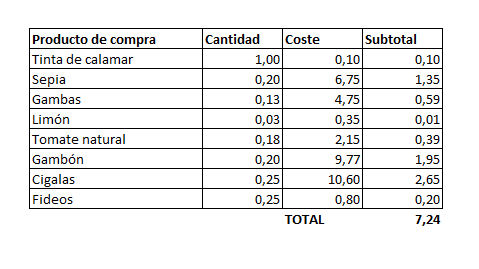 Los productos de compra cuyo stock se descontará, al añadir una ración de ‘fideuà’ en una cuenta, serán estos y para las cantidades indicadas por producto, según la receta o escandallo.