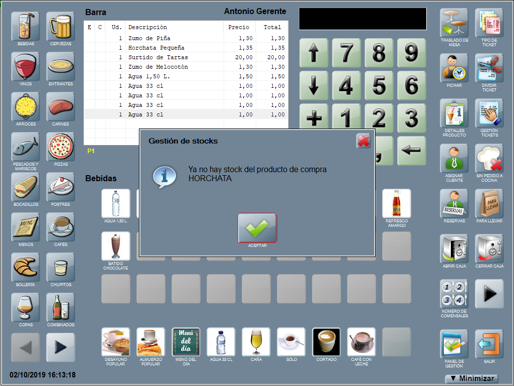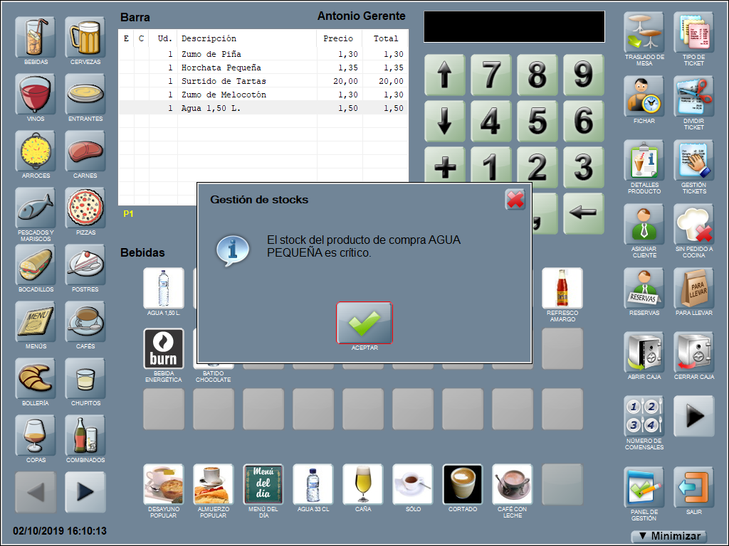 Si configuras Mostrar avisos de stock crítico, aparece la alerta en la pantalla principal de la interfaz, al pulsar un producto con stock crítico.