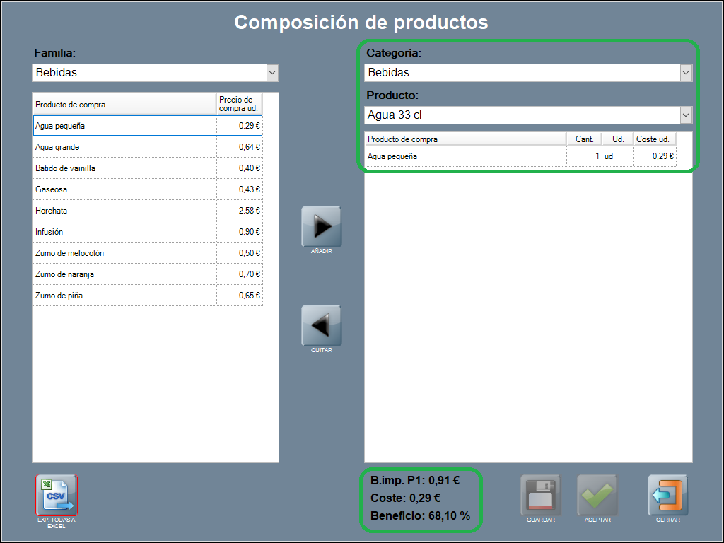 En el ejemplo, el producto de venta ‘agua 33 cl’ descuenta 1 unidad (ud) del producto de compra ‘agua pequeña’, a un coste de 0,29 €.